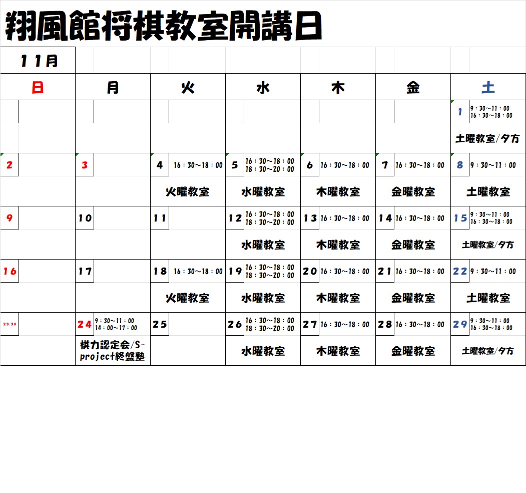 ※11/29は「第五週」ですが12/27(土)が「U18将棋スタジアム」開催日となるため前倒しして開講いたします