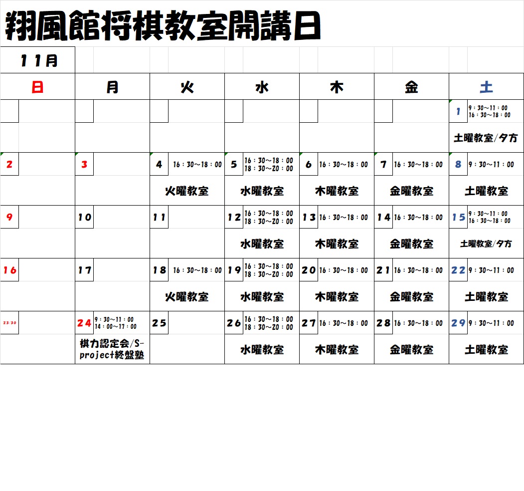 ※11/29は「第五週」ですが12/27(土)が「U18将棋スタジアム」開催日となるため前倒しして開講いたします
