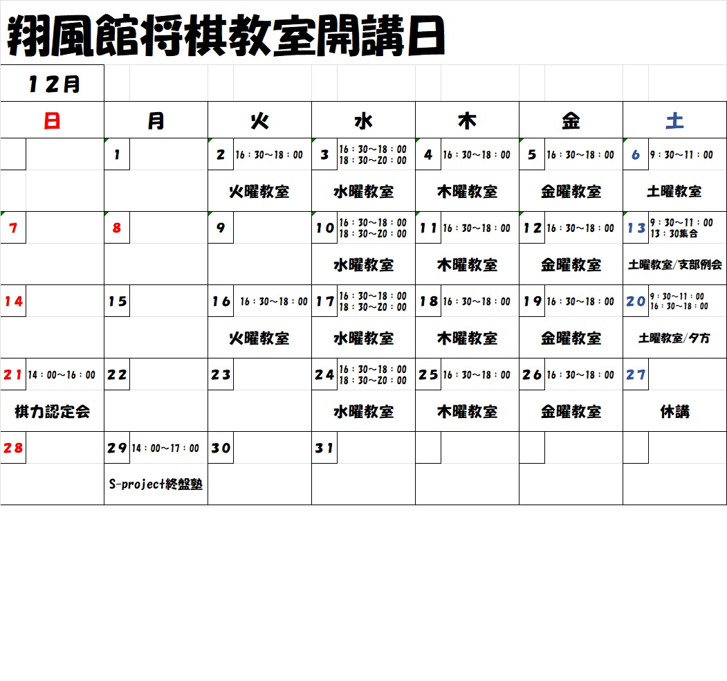 ※12月27日は「U18将棋スタジアム」が開催されるため教室は休講となります