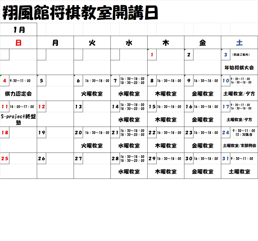 ※1月は「第一週」が3日で三が日に当たるため「土曜教室夕方」の開講日を1月10日の土曜日とさせていただきます